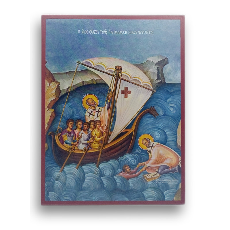 Tato nádherná ikona zobrazuje svatého Mikuláše v biskupském oděvu, jak zasahuje, aby zachránil člověka před utonutím v bouřlivých mořských vlnách. Ikona evokuje pocit ochrany a naděje. Ikona je vytvořena v Řecku s měřítkem 25x19 cm, je umístěna na pevném dřevěném podkladu a opatřena ouškem pro snadné pověšení. Je to skvělý příklad pravoslavné ikonografie, která spojuje historický příběh světce s uměleckým mistrovstvím.