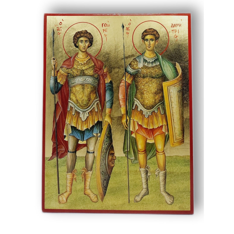 Tato ikona představuje svaté Jiřího a Demetria, dva významné křesťanské mučedníky a válečníky, kteří jsou ctěni pro svou odvahu a víru. Světci jsou zobrazeni v tradičním řeckém ikonografickém stylu s bohatým pozlaceným pozadím, což podtrhuje jejich svatost. Ikona byla pečlivě vyrobena v Řecku, má rozměr 25x19 cm a je umístěna na kvalitním dřevěném podkladě. Díky praktickému oušku na zadní straně ji lze snadno pověsit na vybrané místo v domácnosti nebo modlitebně.