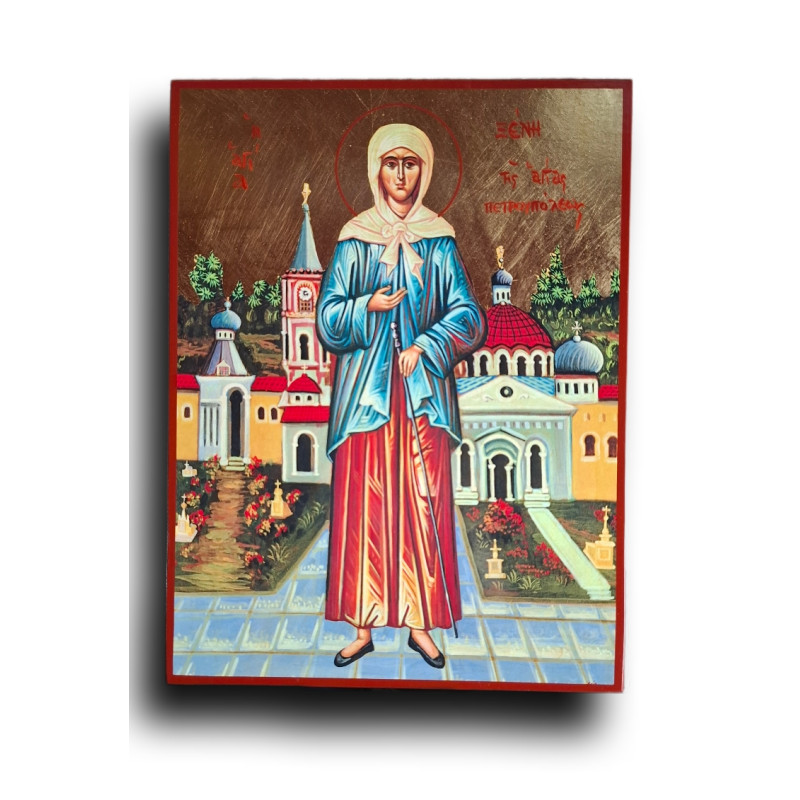 Ikona svaté Xénie z Petrohradu zobrazuje jednu z nejmilovanějších světic ruské pravoslavné tradice. Její život byl ztělesněním pokoje, tichého utrpení a nezištné lásky k lidem. Svatá Xénie se po smrti manžela zřekla všeho, oblékla jeho šaty a žila jako poutnice na ulicích Petrohradu.
