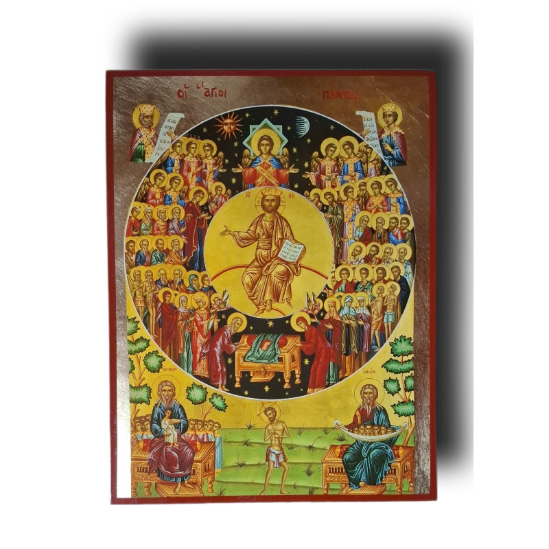 Nápis v horní části: Οἱ Ἅγιοι Πάντες znamená: „Všichni svatí“ – a připomíná, že církev není pouze pozemské shromáždění, ale že každá modlitba, každá liturgie a každé srdce spojené s Kristem je součástí této věčné oslavy.