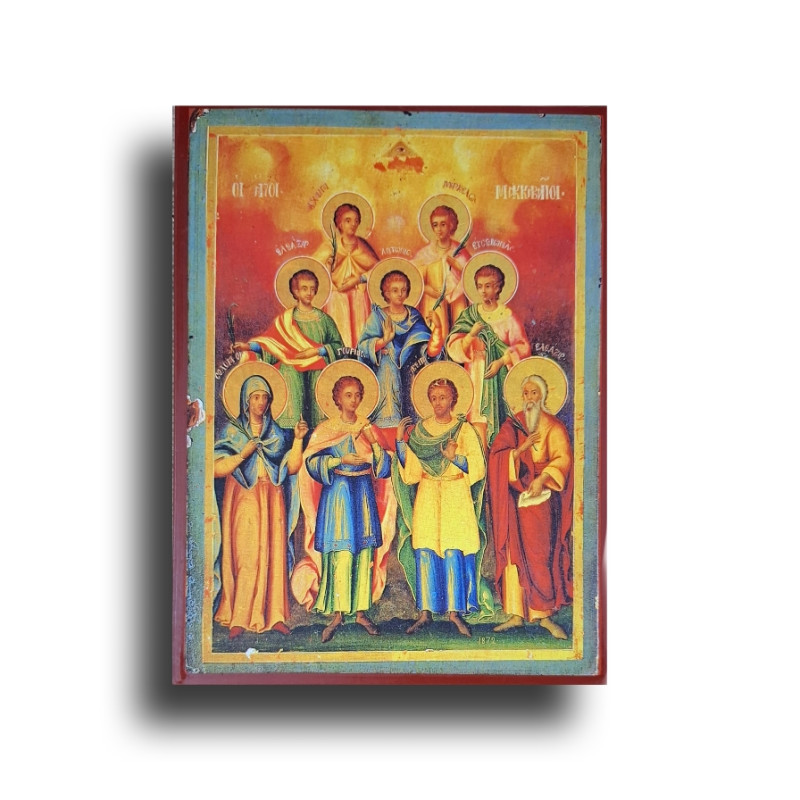 Tato výjimečná ikona zachycuje sedm svatých bratří Makabejských, jejich matku Solomii a učitele Eleazara – hrdiny víry, kteří ve 2. století př. n. l. odmítli zapřít Mojžíšův zákon a obětovat pohanským modlám. Jejich mučednictví je popisováno v 2. knize Makabejské a stalo se symbolem neotřesitelné víry a odvahy i před tváří smrti.