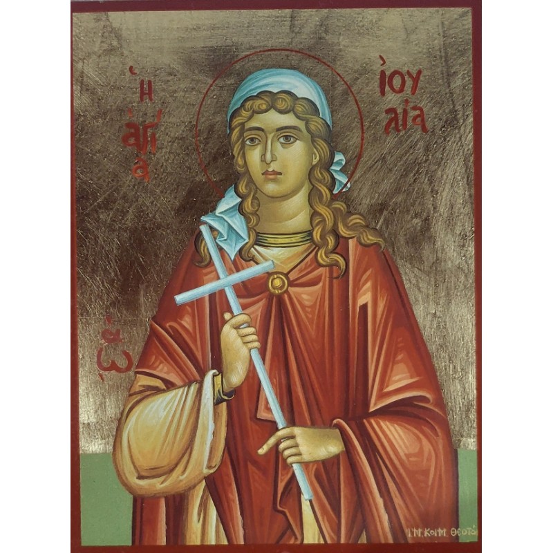 Na ikoně je sv. Julie (kolem r. 400), pocházela z křesťanské rodiny z Kartága. Byla unesena, prodána do otroctví na Korsiku. Když odmítla účast na pohanských obětech, byla pověšena na kříž a umučena hlady.