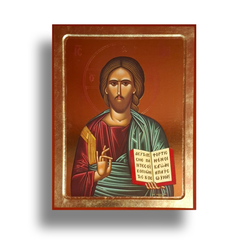 Tato nádherná ikona zobrazuje Krista v klasickém byzantském stylu – s požehnávající pravicí a otevřeným evangeliem v levé ruce. Evangelium nese slova útěchy a pokoje, která pronikají k srdci každého člověka. Kristova tvář je mírná, ale pevná – jeho pohled si nehledá cestu skrze oči, ale skrze duši.