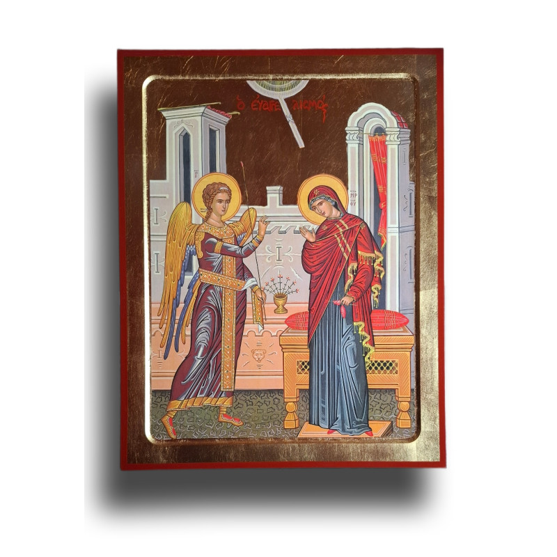 Scéna je plná symbolů: Mariino sklánění hlavy jako výraz pokory a přijetí, Gabrielova ruka natažená v žehnání, zář Ducha Svatého sestupující shůry, a květina v pozadí jako znamení nového života. Ikona není ručně malovaná, ale jedná se o precizní tisk na dřevěném podkladu se zlatou fólií a vyřezávaným rámem, který zvyšuje její důstojnost.