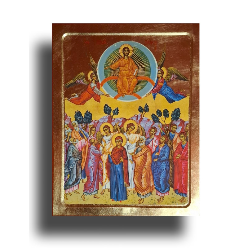Tato ikonografická kompozice zachycuje slavný okamžik Nanebevstoupení Ježíše Krista, jak jej zaznamenává Skutky apoštolů. Kristus, obklopený září slávy, je nesen anděly do nebeské sféry – nikoli jako odchod, ale jako přechod k vyšší Přítomnosti.
