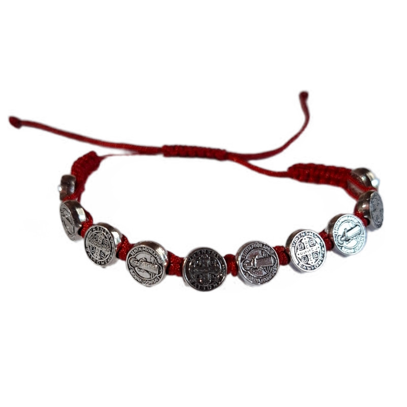 Ručně pletený ochranný náramek, který v sobě nese hluboký duchovní význam. Je osazen deseti drobnými medailonky svatého Benedikta, z nichž každý je oboustranný – na jedné straně zobrazuje svatého Benedikta s křížem a knihou, na druhé straně slavný benediktinský kříž s iniciálami modlitby proti zlému.