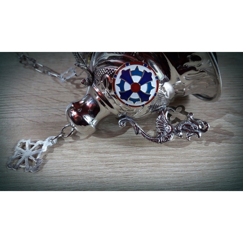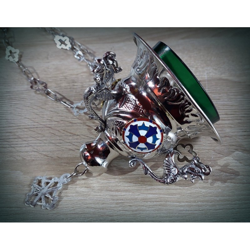 Ručně vyráběná, byzantská, církevní závěsná olejová lampa. Lampa se pověsí na háček navrtaný na strop nebo na zeď před ikonu, obrázek nebo užít jako ozdobu. V ceně je i věšáček na olejovou lamp. Doporučujeme si také pořídit knoty do lamp.