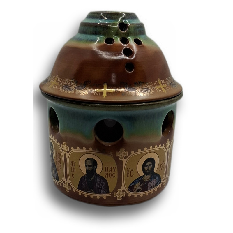Na povrchu lampy jsou zobrazeny posvátné ikony – uprostřed Kristus, po stranách apoštolové, kteří tvoří živé společenství svatých. Tyto obrazy nás zvou k vnitřnímu usebrání a připomínají, že jsme obklopeni oblakem svědků, kteří se za nás přimlouvají.