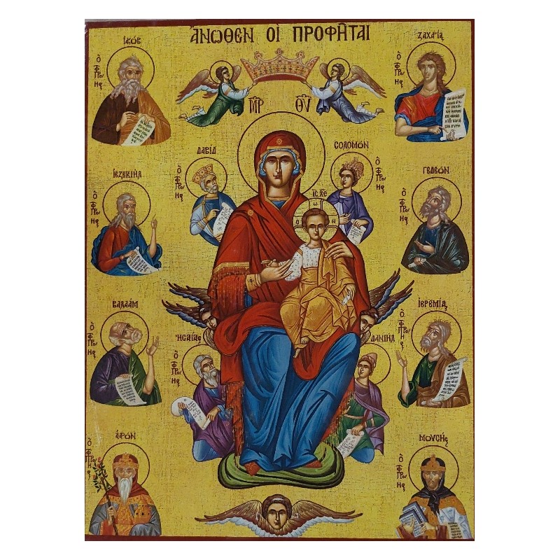 Na ikoně je Panna Maria s Kristem se starozákonními proroky.