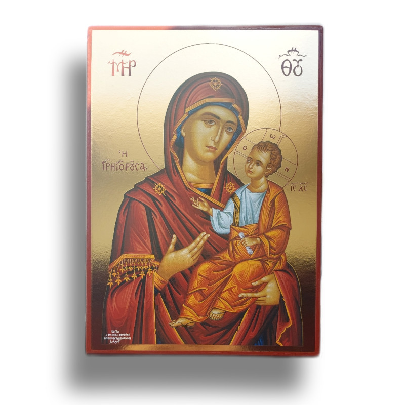 Přineste si domů ikonu Panny Marie Grigorusa, milovanou v pravoslavném světě pro svou rychlou pomoc v těžkých časech. Vyrobená s respektem k tradici v Řecku, tato ikona o rozměrech 25x19 cm je nádherným příkladem křesťanské ikonografie. Ztvárnění Panny Marie s Ježíšem na této dřevěné ikoně je symbolem ochrany a milosrdenství. S ouškem pro jednoduché pověšení je ideální pro modlitební koutek nebo jako součást sbírky duchovního umění.