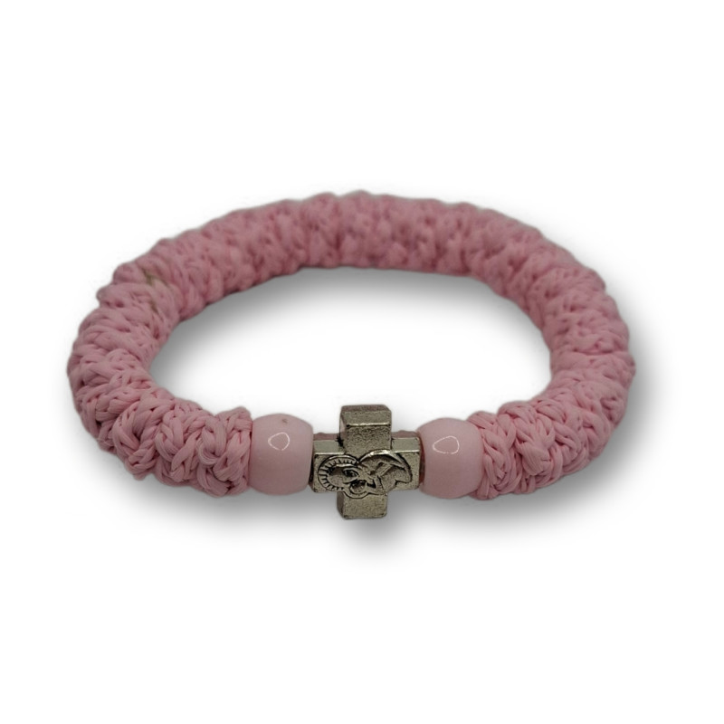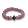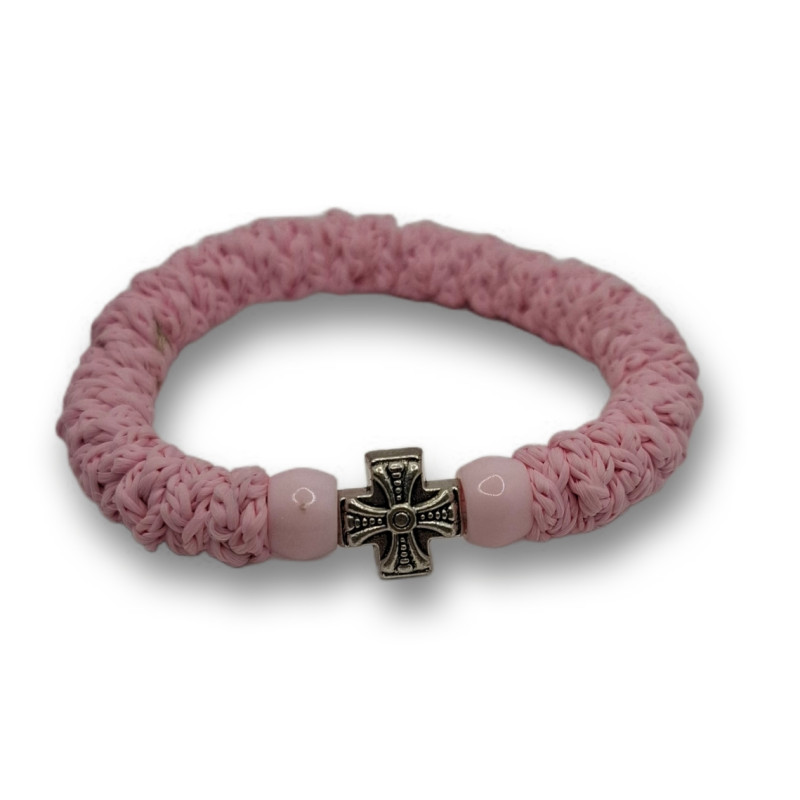 Jemný a stylový modlitební náramek, ručně vyrobený v řeckém klášteře. Tento jedinečný doplněk obsahuje 33 uzlů, symbolizujících roky života Ježíše Krista, a je ozdoben kovovým křížkem a elegantními růžovými korálky.