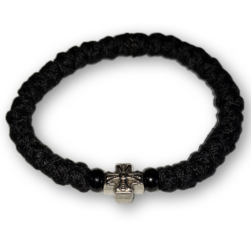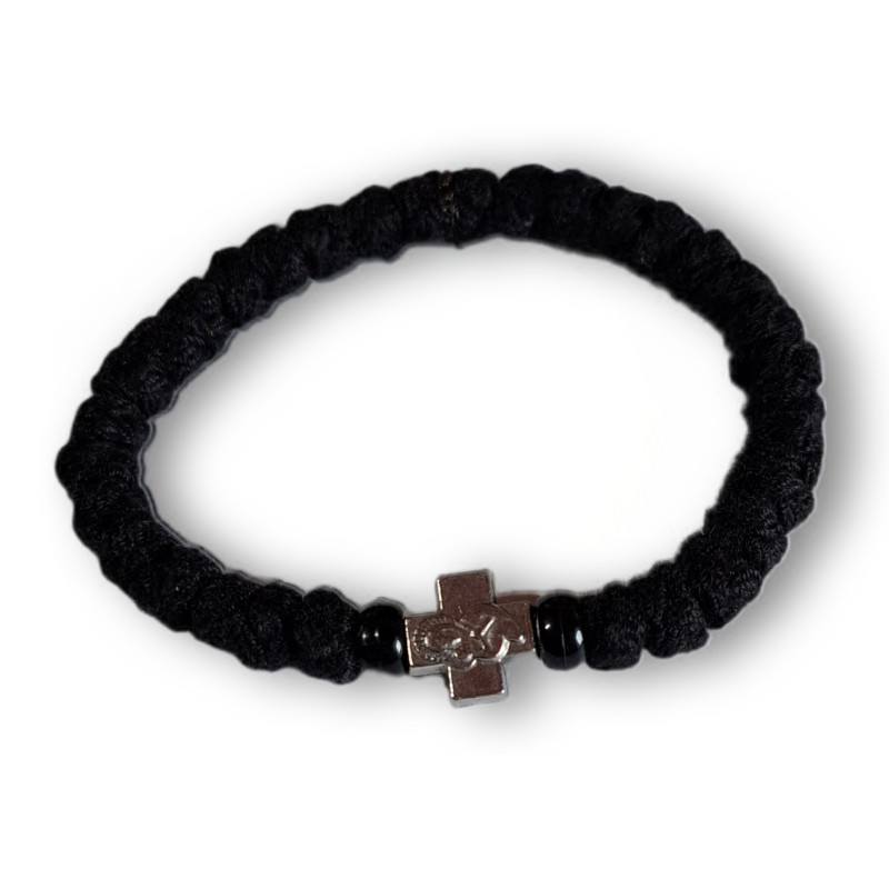 Ručně vyráběný náramek z řeckého kláštera. Tento tradiční ortodoxní modlitební náramek obsahuje 33 uzlů, které symbolizují léta života Ježíše Krista. Je vyroben z jemné černé vlny, zdoben kovovým křížkem a minimalistickými černými korálky.