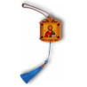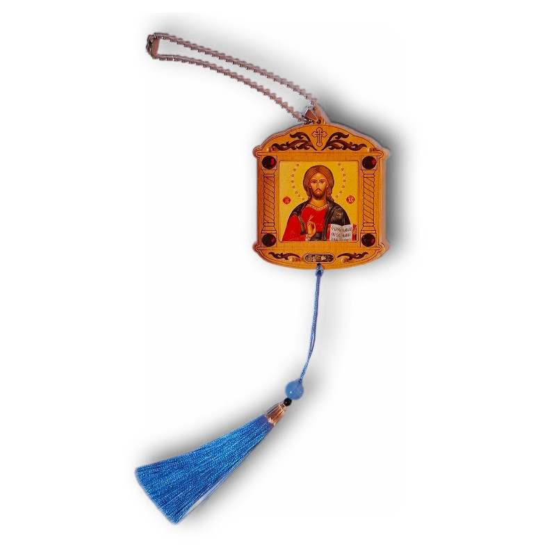 Tradiční přívěsek do auta s ikonou Krista Pantokratora (Vševládce), zobrazující Spasitele s požehnáním a otevřeným evangeliem. Ikona v teplých zlatavých tónech je zasazena do jemně zdobeného rámu a doplněna modrým střapcem s korálkem. Symbol víry, naděje a klidného putování.