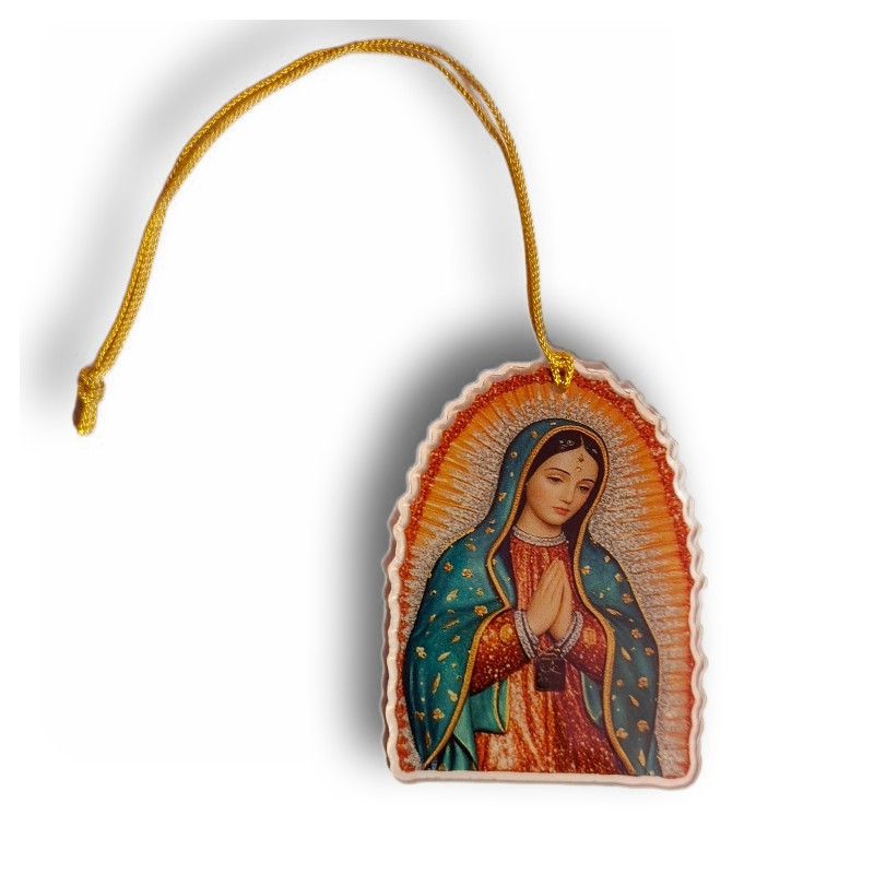 Závěsný přívěsek do auta s motivem inspirovaným známým obrazem Panny Marie. Jemný tisk na akrylovém podkladu s lesklým povrchem, tvarovaným okrajem a zlatou šňůrkou. Ideální na zpětné zrcátko jako tichý doprovod na vašich cestách.