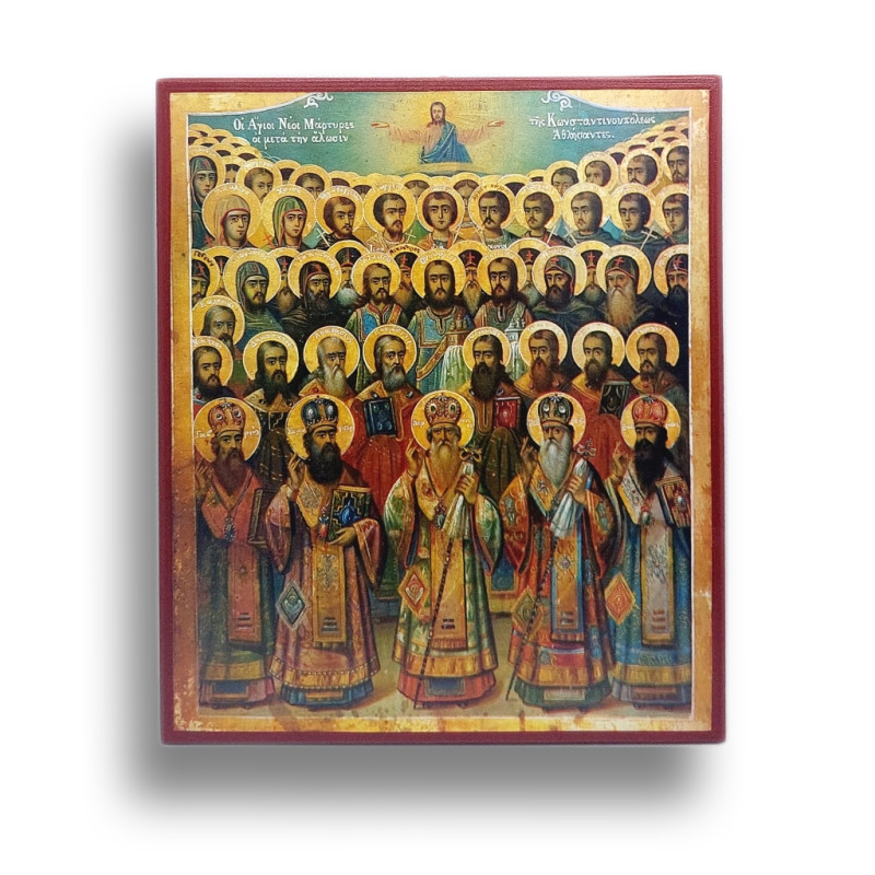 Tato pozoruhodná ikona znázorňuje skupinu Novomučedníků Konstantinopolských, která představuje ty, kteří byli pronásledováni a umučeni za svoji víru v průběhu osmanské nadvlády nad Byzancí. Vyrobená v Řecku s rozměry 23x19 cm, ikona je vyobrazením odvahy a neochvějné víry v Krista. Umístěná na dřevěném podkladu s ouškem pro snadné pověšení, tato ikona je duchovním připomenutím hrdinství těch, kdo obětovali svůj život za pravdu evangelia.
