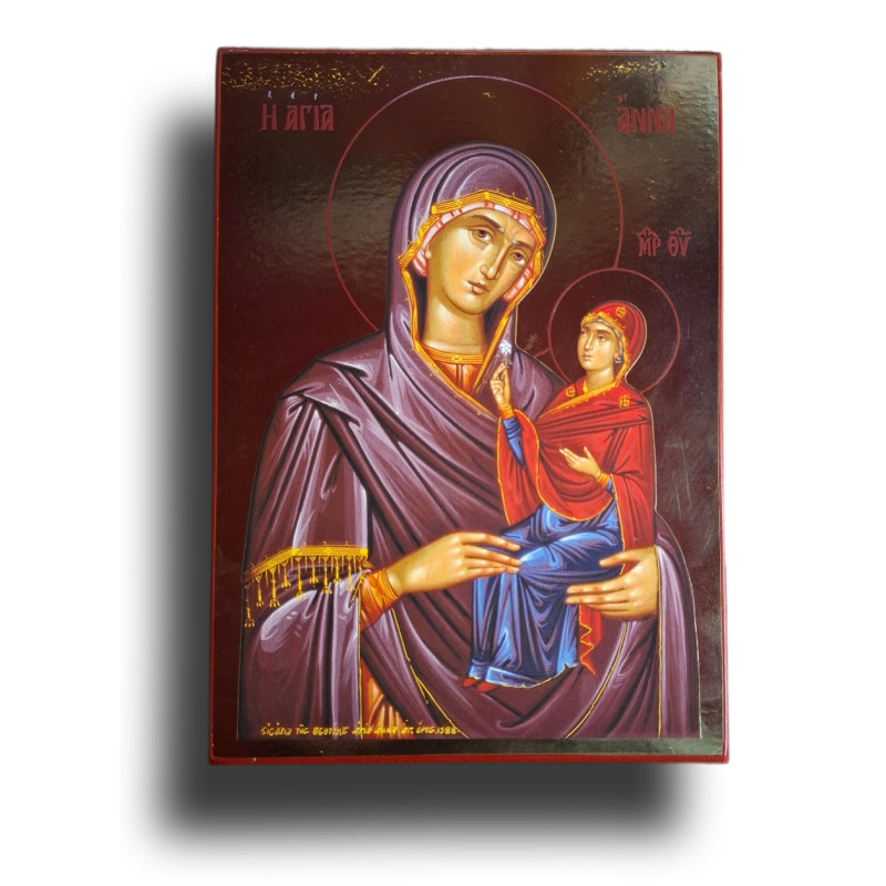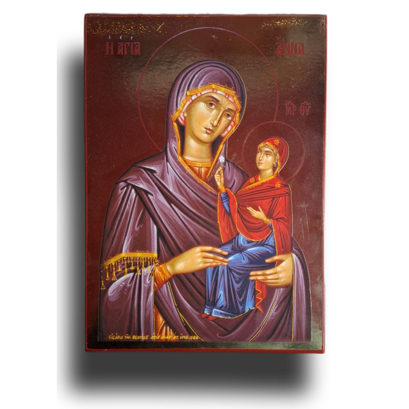 Tato působivá ikona zobrazuje svatou Annu, matku Panny Marie, jak s něžností drží svou dceru, malou Marii, která se později stane Bohorodičkou. Je to výjimečný okamžik – připomínka, že Boží příběh spásy začíná v rodině, v lásce matky k dítěti, v každodenním tichém darování.