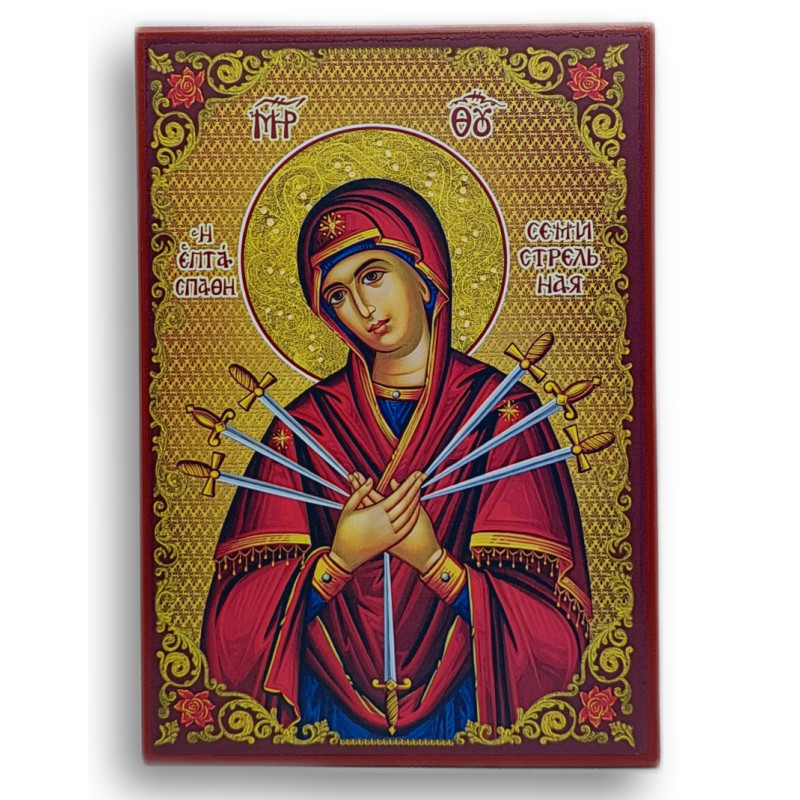Ikona Panny Marie Sedmibolestné, vyjádřená v bohatém ruském stylu a precizní řemeslné práci, odráží hluboké soucítění a matčinu láska při pohledu na trápení svého syna. Tento vyjádřený kus náboženského umění, vytvořený v Řecku, má rozměry 21x15 cm a je zhotoven na kvalitním dřevěném podkladě s ouškem pro pohodlné zavěšení. Každý z sedmi mečů, které pronikají srdce Panny Marie, symbolizuje jednu z bolestí, které podstoupila v jejím životě, čímž tento obraz ztělesňuje hlubokou víru a vytrvalost.