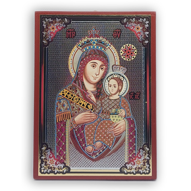 Nádherná ikona Panny Marie z Betléma je vyjádřením hlubokého náboženského uctívání a umění. S překrásným stříbrným tiskem, který zdůrazňuje každý detail její a Ježíškova portrétu, je tato dřevěná ikona vyráběna s láskou v Řecku. S rozměry 18x14 cm, je tento posvátný obraz opatřen ouškem na zavěšení a stane se bezpochyby centrem pozornosti v každé pravoslavné domácnosti nebo sbírce.