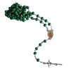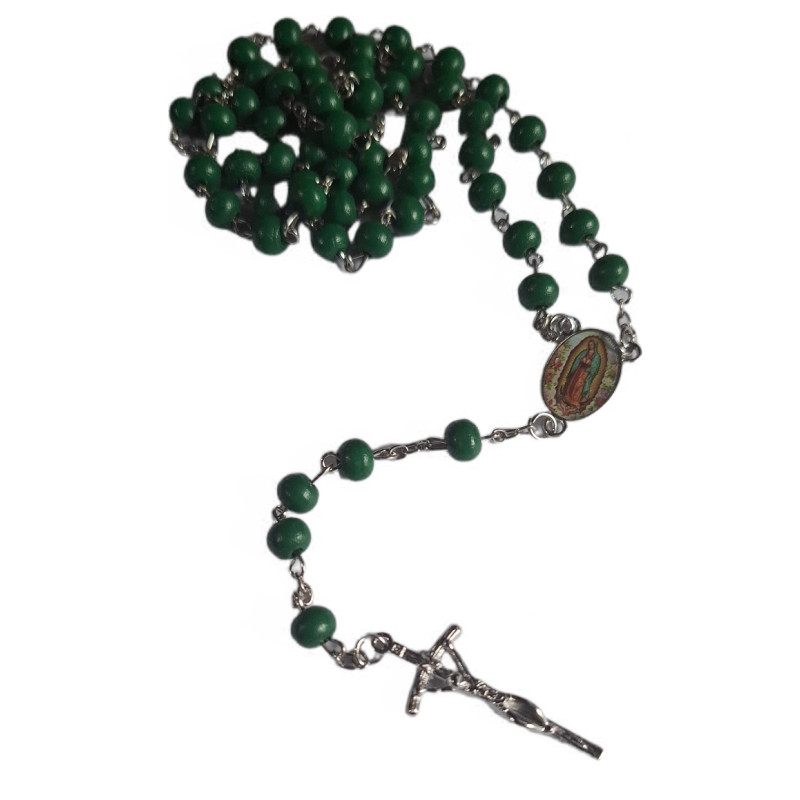 Tento elegantní růženec spojuje jednoduchou krásu a hluboký duchovní význam. Je vyroben z kovového řetízku a zelených korálků, které symbolizují život, naději a nový začátek. Uprostřed růžence se nachází medailon s vyobrazením Panny Marie Guadalupské – ochránkyně a přímluvkyně věřících, která se zjevila v Mexiku roku 1531.
