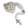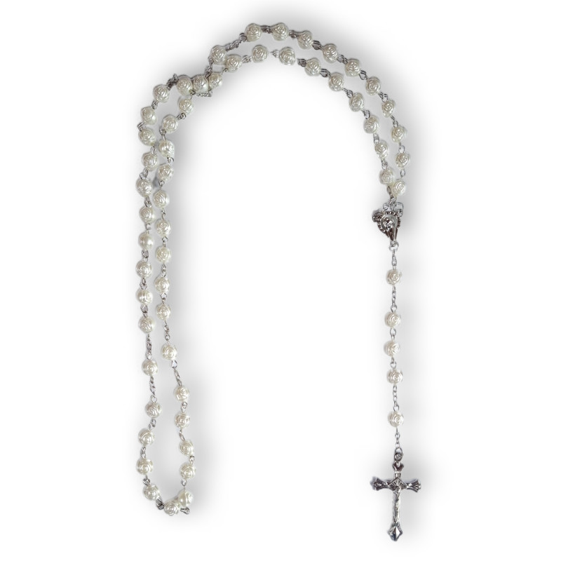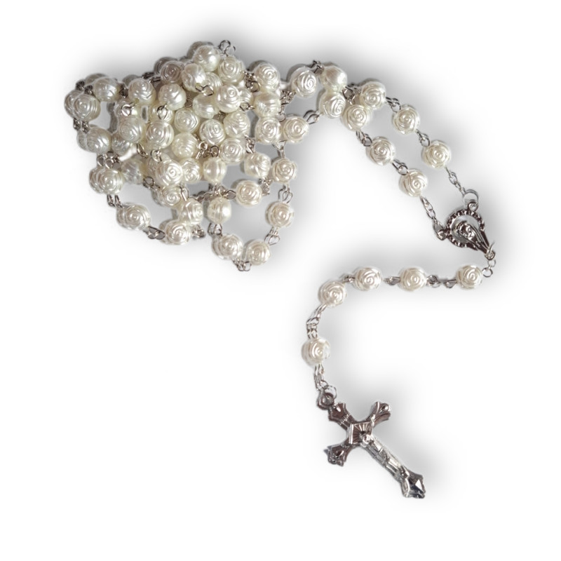 Nádherný růženec s jemnými bílými korálky ve tvaru růží představuje spojení elegance a hlubokého duchovního významu. Každý korálek připomíná květ čistoty a modlitby – růži, která se tradičně pojí s Pannou Marií. Růženec je vyroben z odolného kovu a plastových perliček v podobě růží, které působí perleťovým dojmem.