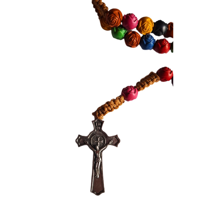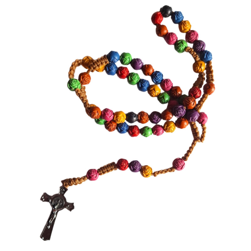 Tento výrazný růženec o délce 50 cm je skutečnou oslavou víry a radosti. Každý korálek ve tvaru drobné růže je vyroben z lehkého plastu v pestrých barvách duhy, které symbolizují naději, Boží lásku a krásu modlitby. Růžence tak dodávají veselý a povzbudivý vzhled.
