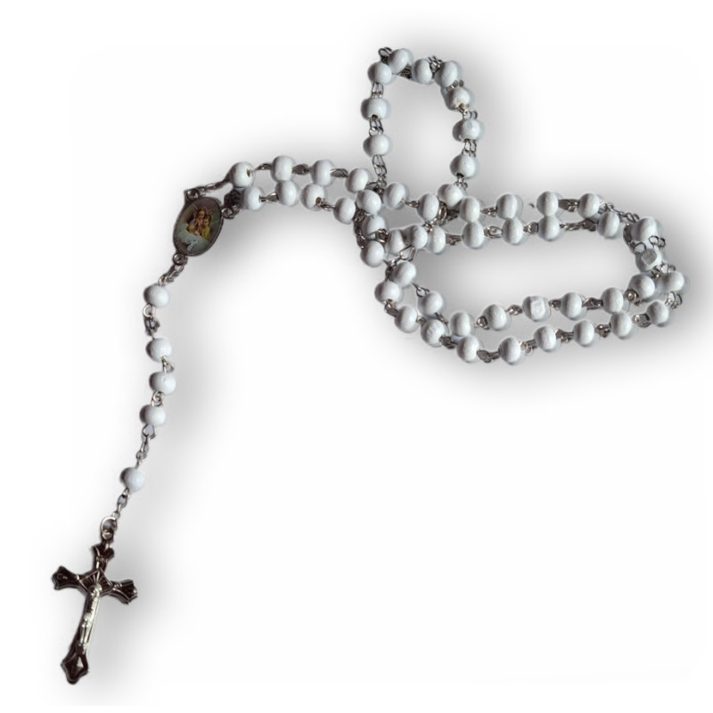 Tento jemně zpracovaný růženec o délce 50 cm spojuje přírodní dřevěné korálky v bílé barvě s pevným kovovým řetízkem, čímž vytváří harmonické propojení tradice a elegance. Každý korálek je pečlivě navlečen, aby vám poskytl pohodlí při modlitbě i každodenním nošení.