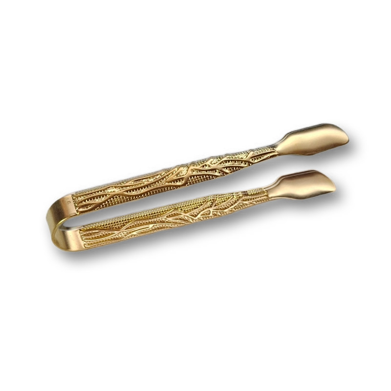 Praktické a elegantní kleštičky určené k bezpečné manipulaci s uhlíky. Jsou vyrobené z kovu se zlatým povrchem a jemným reliéfním zdobením, které jim dodává tradiční a ušlechtilý vzhled.