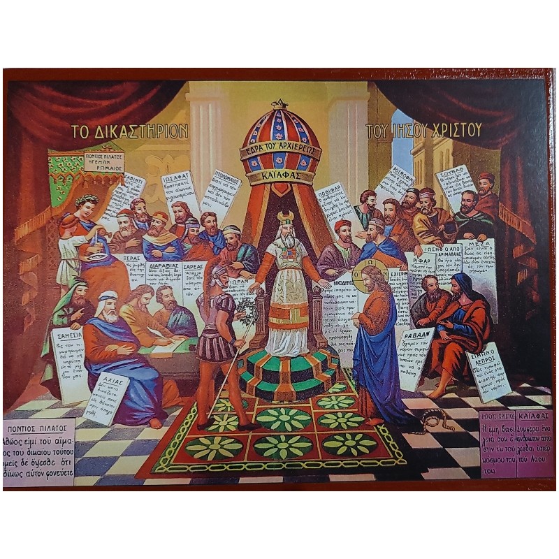 Na ikoně je Ježíš před židovskou veleradou. U každého člena velerady je popis falešného obvinění.