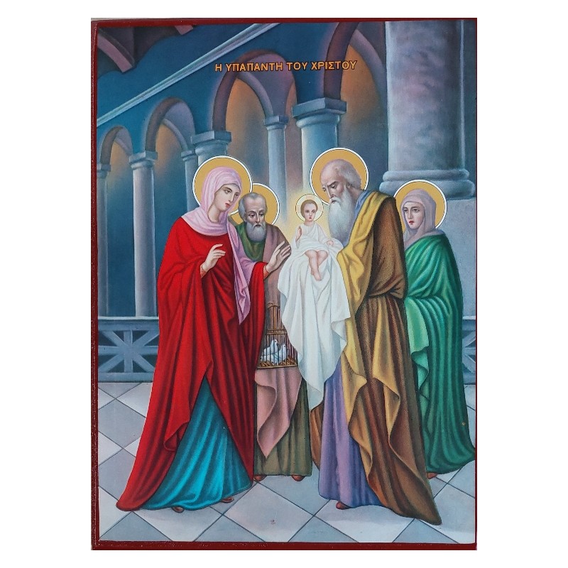 Na ikoně je malý Ježíš se Simeonem., Pannou Marií a sv. Josefem.